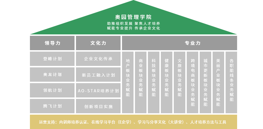 中國奧園集團(tuán)一貫高度重視人才培養(yǎng),集團(tuán)管理學(xué)院覆蓋各層級員工開展人才培養(yǎng)項目,幫助員工持續(xù)成長及發(fā)展。學(xué)院已形成“三縱三橫”教學(xué)體系,致力打造領(lǐng)導(dǎo)力、文化力和專業(yè)力三大支柱能力培養(yǎng)體系,同時積極開展人才梯隊建設(shè)項目、業(yè)務(wù)培訓(xùn)賦能項目、業(yè)界經(jīng)驗交流項目三類培訓(xùn)項目。從專業(yè)到管理,從學(xué)習(xí)到實(shí)踐,學(xué)院全方位地幫助員工提升知識、技能和素質(zhì),滿足員工職業(yè)發(fā)展所需,助力集團(tuán)經(jīng)營目標(biāo)達(dá)成。