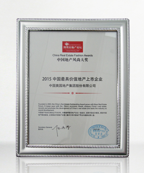 2015年8月11-14日,2015博鰲房地產(chǎn)論壇在三亞盛大舉辦。在12日晚2015年度中國地產(chǎn)風(fēng)尚大獎(jiǎng)?lì)C獎(jiǎng)中,奧園集團(tuán)憑借企業(yè)綜合實(shí)力和潛在成長性榮獲“2015中國最具價(jià)值地產(chǎn)上市企業(yè)”榮譽(yù)。