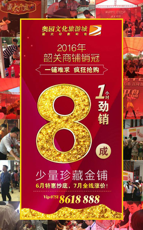 (2016年6月25日——韶關(guān))韶關(guān)這個(gè)夏天很“熱”,其中最熱的莫過于韶關(guān)奧園文化旅游城。6月25日,萬眾期待的商業(yè)街金鋪在這個(gè)火熱的夏天盛大開盤, 首期商業(yè)開盤僅1小時(shí)內(nèi)所推商鋪就勁銷8成,該盛況讓客戶驚嘆、讓業(yè)界側(cè)目,讓許多未出手的客戶惋惜!韶關(guān)奧園文化旅游城,韶關(guān)首創(chuàng)第五代室外商業(yè)步行街,奧園商管公司統(tǒng)一經(jīng)營,10年70%超高回報(bào),讓商業(yè)開盤首日火爆搶購、一鋪難求,當(dāng)之無愧2016年韶關(guān)商業(yè)銷售冠軍。