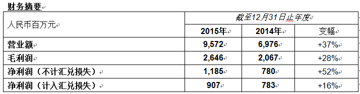 于2015年,奧園業(yè)務(wù)持續(xù)穩(wěn)健發(fā)展,本公司的營業(yè)額約為人民幣95.7億元,同比增加約37%。毛利增長約28%至約人民幣26.5億元,毛利率約為27.6%。計入?yún)R兌損失前后的凈利潤分別約為人民幣11.9億元和9.1億元,按年增長分別約52%和16%。每股基本盈利約為人民幣29.2分。董事會建議派發(fā)末期息每股人民幣8.8分。