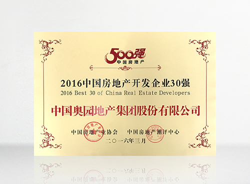 “2016中國房地產(chǎn)開發(fā)企業(yè)30強”第29名榮譽證書