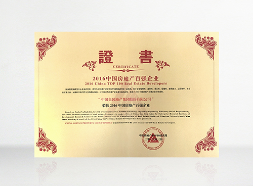 “2016中國房地產(chǎn)百強企業(yè)” 第29名榮譽證書