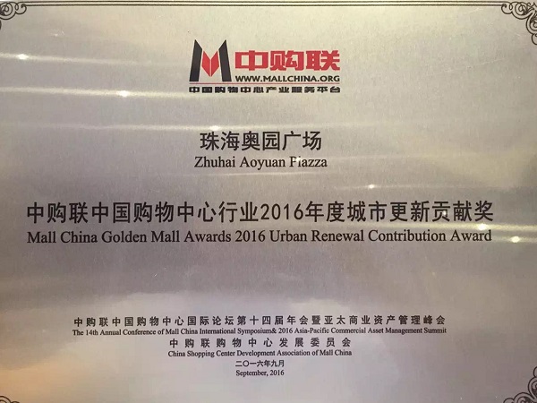 珠海奧園廣場(chǎng)獲得“中購(gòu)聯(lián)中國(guó)購(gòu)物中心行業(yè)2016年度城市更新貢獻(xiàn)獎(jiǎng)”