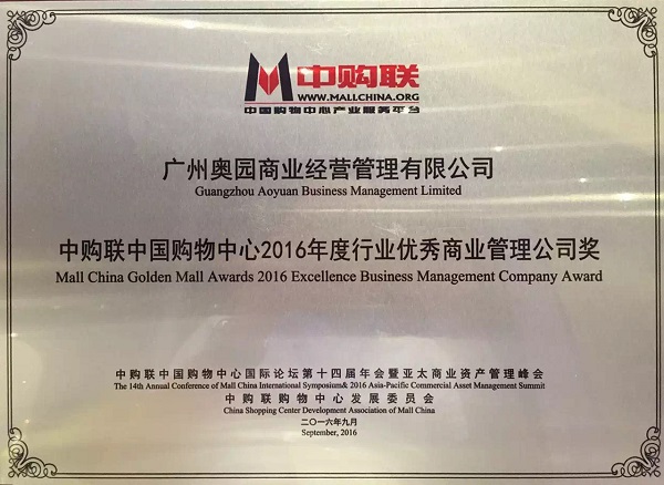 廣州奧園商業(yè)經(jīng)營(yíng)管理有限公司獲得“中購(gòu)聯(lián)中國(guó)購(gòu)物中心2016年度行業(yè)優(yōu)秀商業(yè)管理公司獎(jiǎng)”