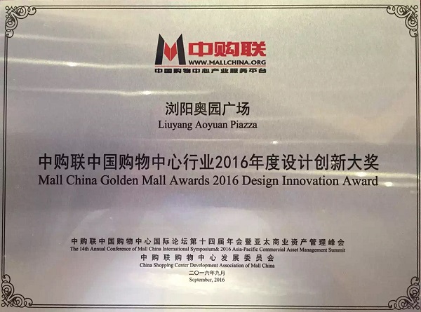 瀏陽(yáng)奧園廣場(chǎng)獲得“中購(gòu)聯(lián)中國(guó)購(gòu)物中心行業(yè)2016年度設(shè)計(jì)創(chuàng)新大獎(jiǎng)”