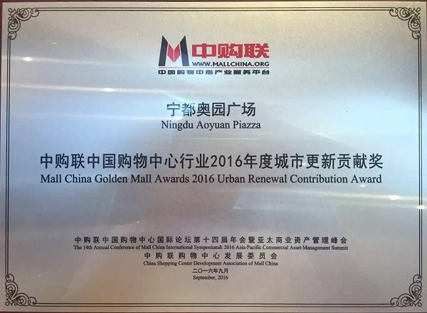 寧都奧園廣場(chǎng)獲得“中購(gòu)聯(lián)中國(guó)購(gòu)物中心行業(yè)2016年度城市更新貢獻(xiàn)獎(jiǎng)”