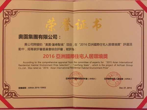 2016亞洲國(guó)際住宅人居環(huán)境獎(jiǎng) 證書/獎(jiǎng)牌