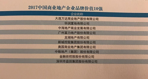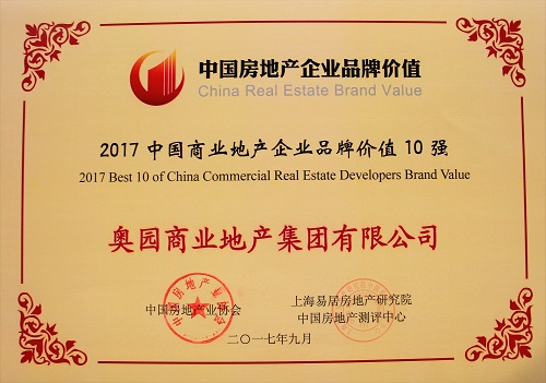 奧園商業(yè)地產(chǎn)集團榮膺“2017中國商業(yè)地產(chǎn)企業(yè)品牌價值10強”