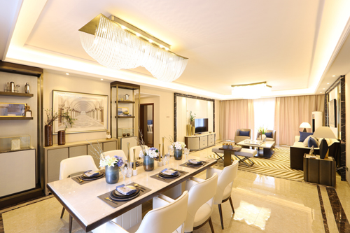 國(guó)慶期間開放的兩套精裝樣板房,戶型分別為170㎡和220㎡,為現(xiàn)代簡(jiǎn)約風(fēng)格。創(chuàng)新蝶形拼接戶型,戶戶視角分離,保證私密起居。其中220㎡四房?jī)蓮d三衛(wèi),擁85.7%高使用率,大格局客廳連餐廳,10米進(jìn)深、5.4米開間,墅質(zhì)享受。三套間設(shè)計(jì),主臥享4.2米開間,7米進(jìn)深,坐擁全景大陽(yáng)臺(tái),24小時(shí)美景熏陶。