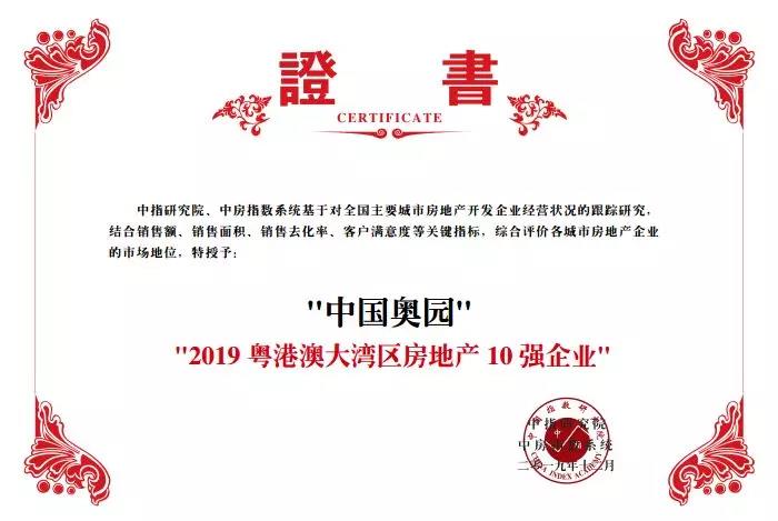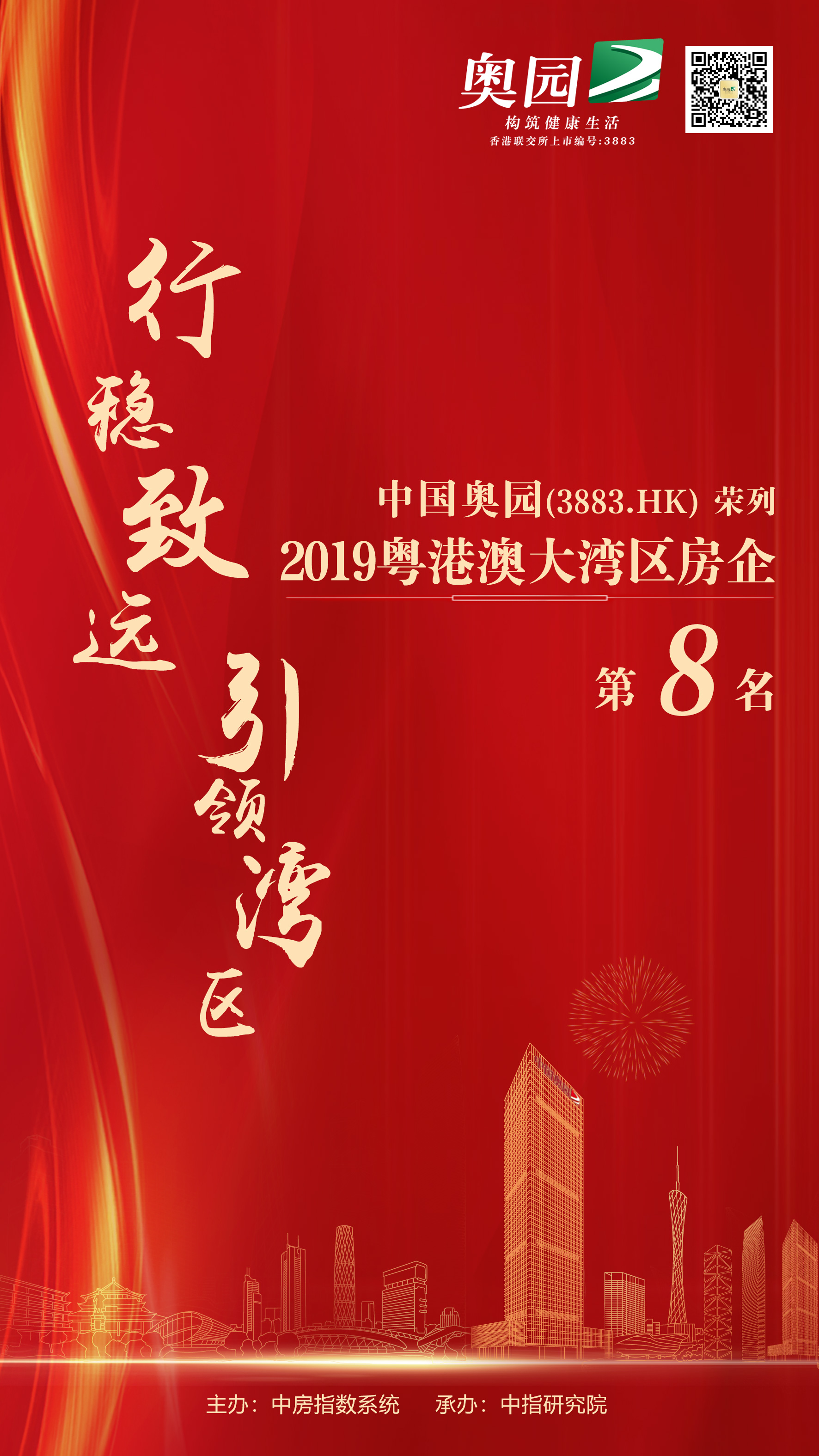 中國(guó)奧園憑借在粵港澳大灣區(qū)房地產(chǎn)市場(chǎng)的業(yè)績(jī)表現(xiàn)榮獲“2019粵港澳大灣區(qū)房地產(chǎn)10強(qiáng)企業(yè)”第8名。