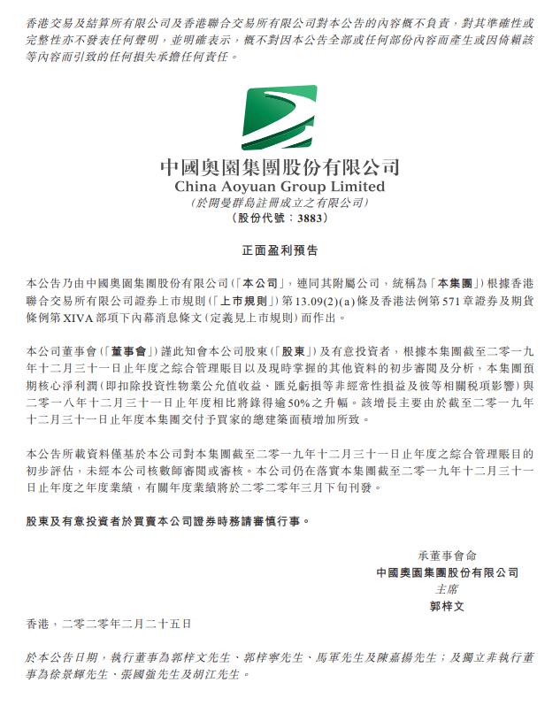 中國(guó)奧園:預(yù)計(jì)2019年核心凈利潤(rùn)同比增幅逾50%