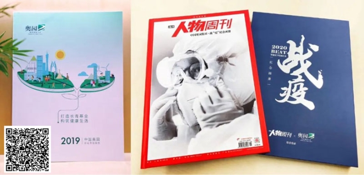 中國奧園CSR報告(左)和戰(zhàn)疫畫冊(右),識別二維碼可查看CSR報告詳情