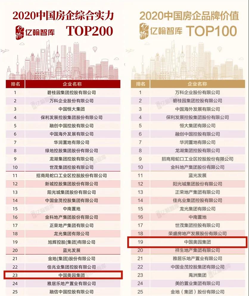 8月19日,由億翰智庫(kù)舉辦的中國(guó)房企百?gòu)?qiáng)峰會(huì)在上海召開,公布了“2020中國(guó)房企綜合實(shí)力TOP200企業(yè)研究”結(jié)果。中國(guó)奧園憑借強(qiáng)勁的綜合實(shí)力和良好的客戶口碑,一舉攬下“中國(guó)房企綜合實(shí)力第23名”“中國(guó)房企品牌價(jià)值第19名”“中國(guó)房企商業(yè)物業(yè)價(jià)值第5名” 三項(xiàng)大獎(jiǎng),同時(shí)榮登“2020中國(guó)房地產(chǎn)企業(yè)城市更新領(lǐng)域十強(qiáng)”“中國(guó)房地產(chǎn)企業(yè)雇主品牌十五強(qiáng)”“中國(guó)商業(yè)地產(chǎn)企業(yè)創(chuàng)新性五強(qiáng)”等九項(xiàng)子榜單。