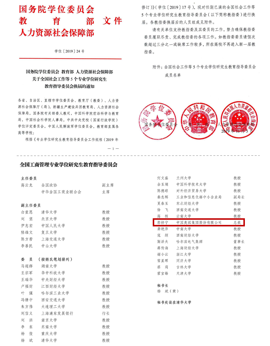 據(jù)國務(wù)院學(xué)位委員會(huì)、教育部、人力資源社會(huì)保障部2019年11月聯(lián)合印發(fā)的《國務(wù)院學(xué)位委員會(huì) 教育部 人力資源社會(huì)保障部關(guān)于全國社會(huì)工作等5個(gè)專業(yè)學(xué)位研究生教育指導(dǎo)委員會(huì)換屆的通知》(學(xué)位〔2019〕24號(hào))顯示,第六屆全國MBA教指委有主任委員1人,由全國政協(xié)副主席、中華全國工商業(yè)聯(lián)合會(huì)主席高云龍擔(dān)任,副主任委員6人,委員28人。鑒于突出的學(xué)術(shù)成就與教育貢獻(xiàn),郭梓寧總裁被選聘為第六屆全國MBA教指委委員,成為國內(nèi)唯一上榜的民營企業(yè)家委員。