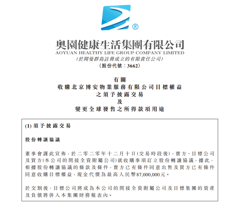 繼4月22日公告收購(gòu)樂(lè)生活智慧社區(qū)服務(wù)集團(tuán)80%的股權(quán)、5月11日公告收購(gòu)寧波宏建物業(yè)服務(wù)有限公司65%股權(quán)。12月10日,奧園健康(3662.HK)再次發(fā)布公告稱,公司擬以不超過(guò)8700萬(wàn)元人民幣(單位下同)現(xiàn)金收購(gòu)北京博安物業(yè)服務(wù)有限公司(以下簡(jiǎn)稱“北京博安”)全部權(quán)益。這已經(jīng)是奧園健康年內(nèi)第三次發(fā)布收購(gòu)物業(yè)管理公司的公告,再一次印證公司專注物業(yè)基礎(chǔ)服務(wù)的決心。