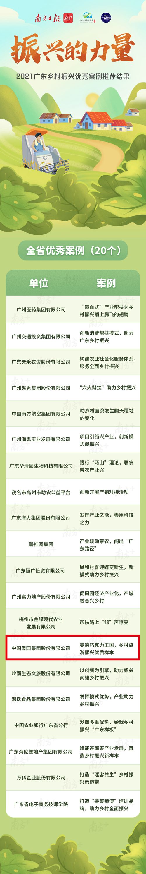 11月25日,由南方報(bào)業(yè)傳媒集團(tuán)主辦的“振興的力量——2021廣東鄉(xiāng)村振興優(yōu)秀案例推介活動(dòng)”評(píng)選結(jié)果正式出爐。中國(guó)奧園集團(tuán)旗下文旅項(xiàng)目——奧園英德巧克力王國(guó)獲評(píng)“廣東鄉(xiāng)村振興優(yōu)秀案例”。