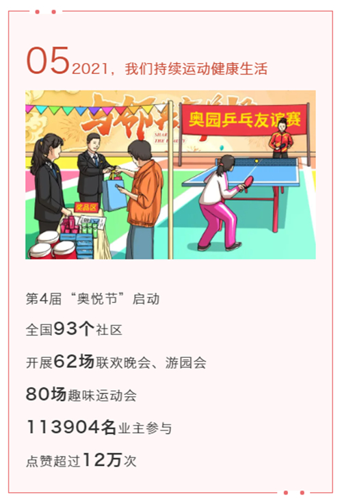 本屆奧悅節(jié)為期3個(gè)多月,覆蓋27座城市、93個(gè)社區(qū),通過(guò)舉辦聯(lián)歡晚會(huì)、健康運(yùn)動(dòng)會(huì)、尊老敬老等活動(dòng)服務(wù)業(yè)主,用實(shí)際行動(dòng)兌現(xiàn)“構(gòu)筑健康生活”的品牌理念。