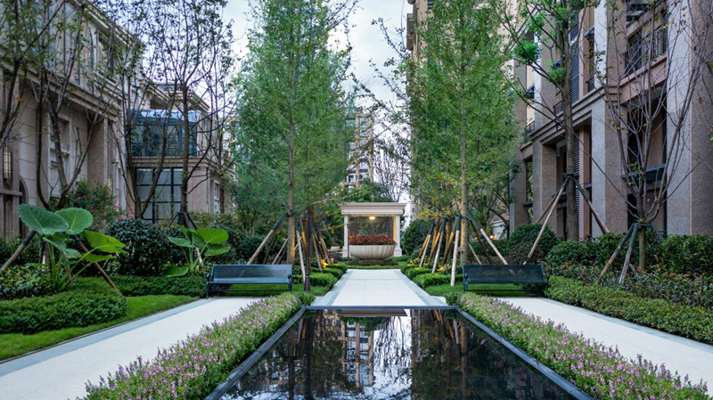 ●成都奧園蔚藍(lán)卡地亞云墅以浪漫的法式藝術(shù),營造林間精致生活,延續(xù)奢居精工品質(zhì),匠心工藝呈現(xiàn)完美交付。項目曾榮獲2021年園冶杯地產(chǎn)園林大區(qū)類景觀銀獎。