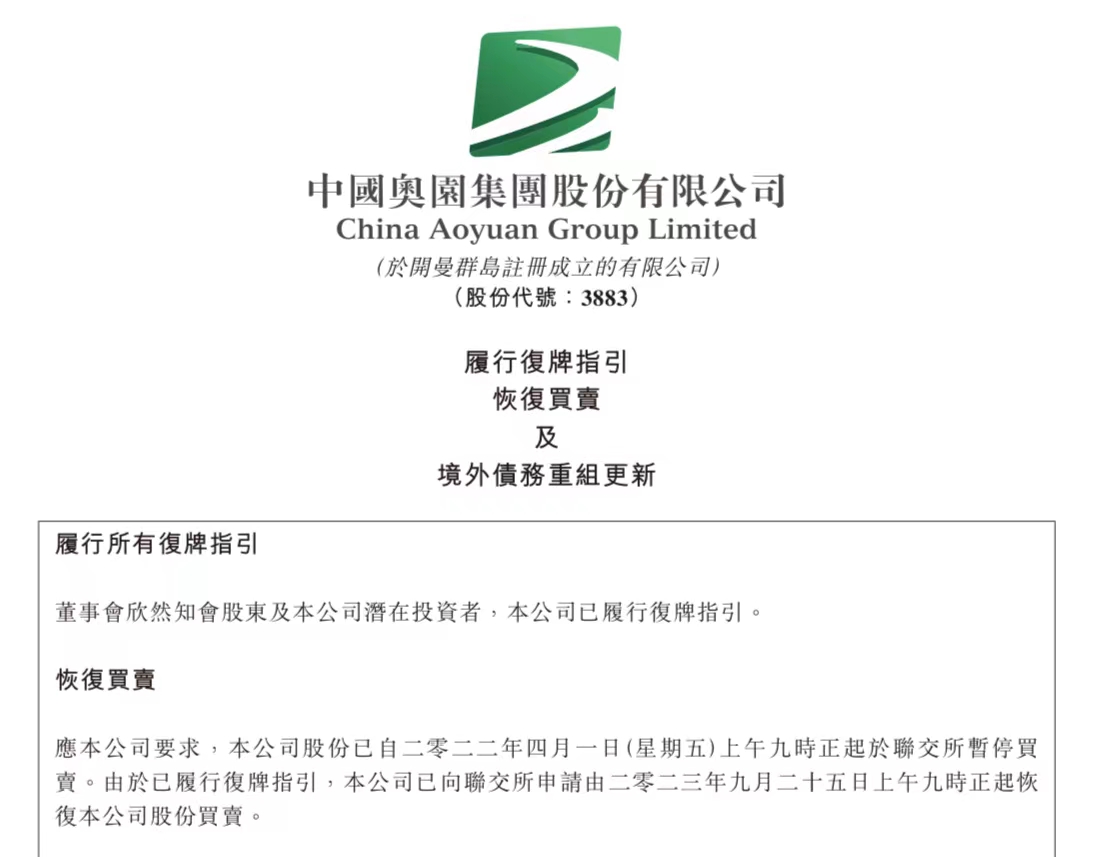 9月22日晚,中國(guó)奧園集團(tuán)(03883.HK)發(fā)布公告,已完成全部復(fù)牌指引相關(guān)工作,將于9月25日上午9時(shí)起正式在香港聯(lián)交所恢復(fù)股票交易。
