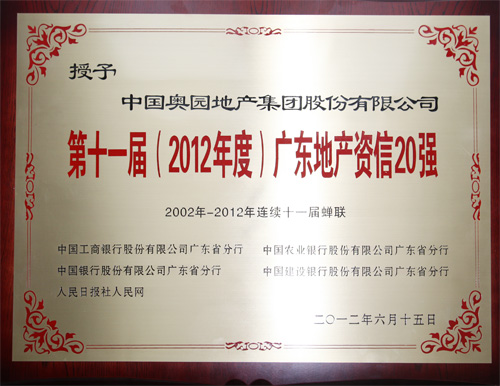 (2012年6月16日——廣州)憑借良好的企業(yè)信譽(yù)和穩(wěn)健的財(cái)務(wù)狀況,中國(guó)奧園地產(chǎn)集團(tuán)日前榮獲由工商銀行、農(nóng)業(yè)銀行、建設(shè)銀行、中國(guó)銀行四大行廣東省分行及人民日?qǐng)?bào)社人民網(wǎng)聯(lián)合舉辦評(píng)審的“第十一屆(2012年度)廣東地產(chǎn)資信20強(qiáng)”稱號(hào),成為連續(xù)十一年蟬聯(lián)該項(xiàng)榮譽(yù)的四家大型廣東省房地產(chǎn)企業(yè)之一。