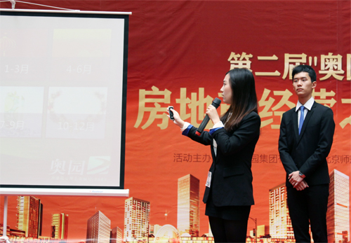 第二屆“奧園杯”房地產(chǎn)經(jīng)營(yíng)之星大賽于4月19日拉開(kāi)序幕,吸引了來(lái)自珠海、廣州地區(qū)高校約600名選手參賽。4月21日,進(jìn)入復(fù)賽的50名學(xué)生,在奧園藝術(shù)團(tuán)團(tuán)長(zhǎng)胡祥龍先生帶領(lǐng)下參觀奧園廣場(chǎng)及奧園養(yǎng)生廣場(chǎng),集團(tuán)人力資源部培訓(xùn)主管戴輝平先生講述了奧園的發(fā)展歷程和企業(yè)文化,奧園百貨公司市場(chǎng)推廣部為學(xué)生們介紹了奧園廣場(chǎng)年度營(yíng)銷策劃主題的有關(guān)情況。5月4日的決賽,通過(guò)奧園廣場(chǎng)項(xiàng)目策劃案例展演、奧園養(yǎng)生廣場(chǎng)沙盤(pán)講解、文藝特長(zhǎng)PK等激烈角逐,最終產(chǎn)生5項(xiàng)個(gè)人獎(jiǎng)和3項(xiàng)團(tuán)隊(duì)獎(jiǎng)。郭梓寧總裁、嚴(yán)駁非副校長(zhǎng)、湯林弟副院長(zhǎng)出席了當(dāng)晚的頒獎(jiǎng)典禮晚宴,為獲獎(jiǎng)學(xué)生和團(tuán)隊(duì)頒獎(jiǎng)并發(fā)表了熱情洋溢的講話,集團(tuán)藝術(shù)團(tuán)為晚宴創(chuàng)作精彩的《青春奧園》現(xiàn)代詩(shī)朗誦,展現(xiàn)了青春奧園的風(fēng)采和奧園與青年人才共成長(zhǎng)的無(wú)限活力。