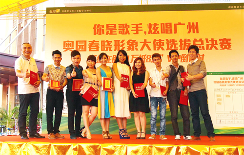 (2013年05月11日——廣州)“你是歌手,炫唱廣州”奧園春曉形象大使選拔總決賽在奧園春曉銷售中心盛情謝幕,來(lái)自廣州各區(qū)的十名優(yōu)秀選手挺進(jìn)總決賽。