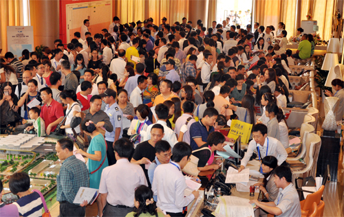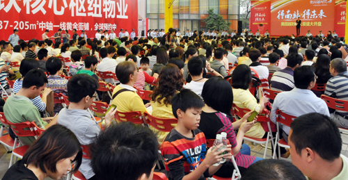 當(dāng)天早上7點(diǎn),南站地區(qū)車流猶如長(zhǎng)龍,項(xiàng)目周邊道路排滿私家車等候進(jìn)入臨時(shí)停車場(chǎng)。8點(diǎn)鐘,距離開盤還有一個(gè)小時(shí),現(xiàn)場(chǎng)等候區(qū)早已人山人海,上千名客戶手里緊緊地拿著搖簽號(hào)。經(jīng)統(tǒng)計(jì),當(dāng)天近兩千名客戶到場(chǎng),掀起了一場(chǎng)樞紐商業(yè)物業(yè)搶奪大戰(zhàn)。