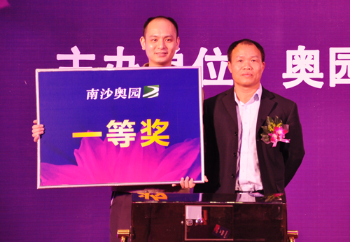 奧園番南片區(qū)副總經(jīng)理陳遠(yuǎn)輝先生為獲得幸運(yùn)大抽獎(jiǎng)環(huán)節(jié)一等獎(jiǎng)的業(yè)主頒獎(jiǎng)