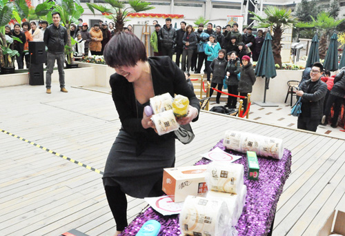 客戶們參觀完售樓中心并聽取置業(yè)顧問對樓盤的講解后,領取到參賽券,美女、辣媽們齊上陣,做著賽前的熱身準備,隨著一聲令下,她們火速跑到對面的禮品區(qū),爭分奪秒的搶禮品,眼疾手快的美女、辣媽們出擊就是穩(wěn)準狠,幾秒鐘的時間里,選手們每個人搶到的禮品數(shù)量都頗為可觀,賽場外親友團的加油吶喊聲也從未間斷,現(xiàn)場氣氛高漲。上午會展廣場的比賽讓美女們都意猶未盡,下午國際城的比賽精彩持續(xù)上演?;顒釉跉g聲笑語中結束,選手們都滿載而歸,此次活動受到了女性客戶們的一致好評,也促進了當天的銷售。