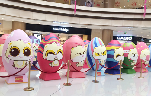 當天除了是奧園廣場“喵星星”兒童主題商城開業(yè)的吉日,也是西方復活節(jié)。奧園廣場為這個特殊的日子量身設計了58顆大彩蛋,彩蛋上惟妙惟肖地畫上了表情各異的吉祥物“喵星人”形象,呆萌形象更讓顧客大呼可愛。