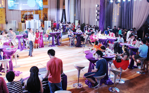 盛典當(dāng)晚,在豪華的蘿崗?qiáng)W園廣場(chǎng)銷(xiāo)售中心,以紫色為主色調(diào)的會(huì)場(chǎng)布置,將每位盛裝出席的貴賓引入格調(diào)高雅之境。伴隨優(yōu)雅的大提琴演奏聲,酒會(huì)正式揭開(kāi)序幕。蘿崗?qiáng)W園廣場(chǎng)貼心的為參加的VIP客戶(hù)們準(zhǔn)備了各式精致自助美食,舌尖上的饕餮盛宴讓大家從視覺(jué)到味覺(jué)無(wú)不享受。