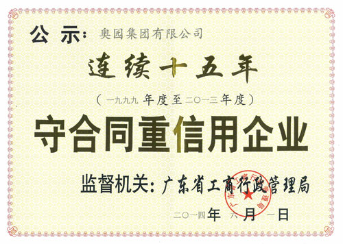 奧團(tuán)集團(tuán)連續(xù)十五年榮獲“廣東省守合同重信用企業(yè)”,充分體現(xiàn)了“高效、誠(chéng)信、責(zé)任”的企業(yè)精神,體現(xiàn)奧園重視合同管理和履行企業(yè)責(zé)任,不斷提升企業(yè)品牌知名度與美譽(yù)度,受到了政府及社會(huì)各界的一致好評(píng)和高度認(rèn)可。