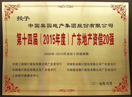 “第十四屆(2015年度)廣東地產(chǎn)資信20強(qiáng)”獲獎(jiǎng)牌