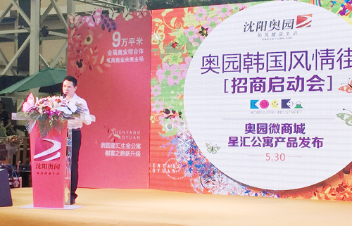 ??? (2015年5月30日——沈陽(yáng))2015年5月30日,沈陽(yáng)奧園商管團(tuán)隊(duì)與沈陽(yáng)奧園地產(chǎn)營(yíng)銷團(tuán)隊(duì)強(qiáng)強(qiáng)聯(lián)合,隆重舉行“沈陽(yáng)奧園韓國(guó)風(fēng)情街招商啟動(dòng)會(huì)暨奧園微商城星匯公寓產(chǎn)品發(fā)布會(huì)”,至此沈陽(yáng)奧園的韓流微商以及投資理財(cái)新產(chǎn)品榮耀面世。沈陽(yáng)片區(qū)總經(jīng)理助理黃繼宗、沈陽(yáng)商管公司籌建負(fù)責(zé)人鄂丹玲、沈陽(yáng)物業(yè)公司總經(jīng)理彭少良等領(lǐng)導(dǎo)出席現(xiàn)場(chǎng),廣大投資者、商戶、業(yè)主、以及華商晨報(bào)、沈陽(yáng)晚報(bào)、騰訊網(wǎng)、搜房網(wǎng)等各大媒體朋友近400人受邀光臨。