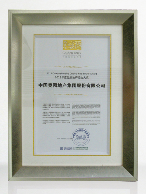 中國奧園榮獲“2015年度品質(zhì)地產(chǎn)綜合大獎”