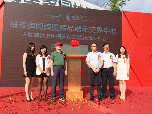 各位領(lǐng)導共同為“蚌埠奧園跨境商品展示交易中心”揭牌!