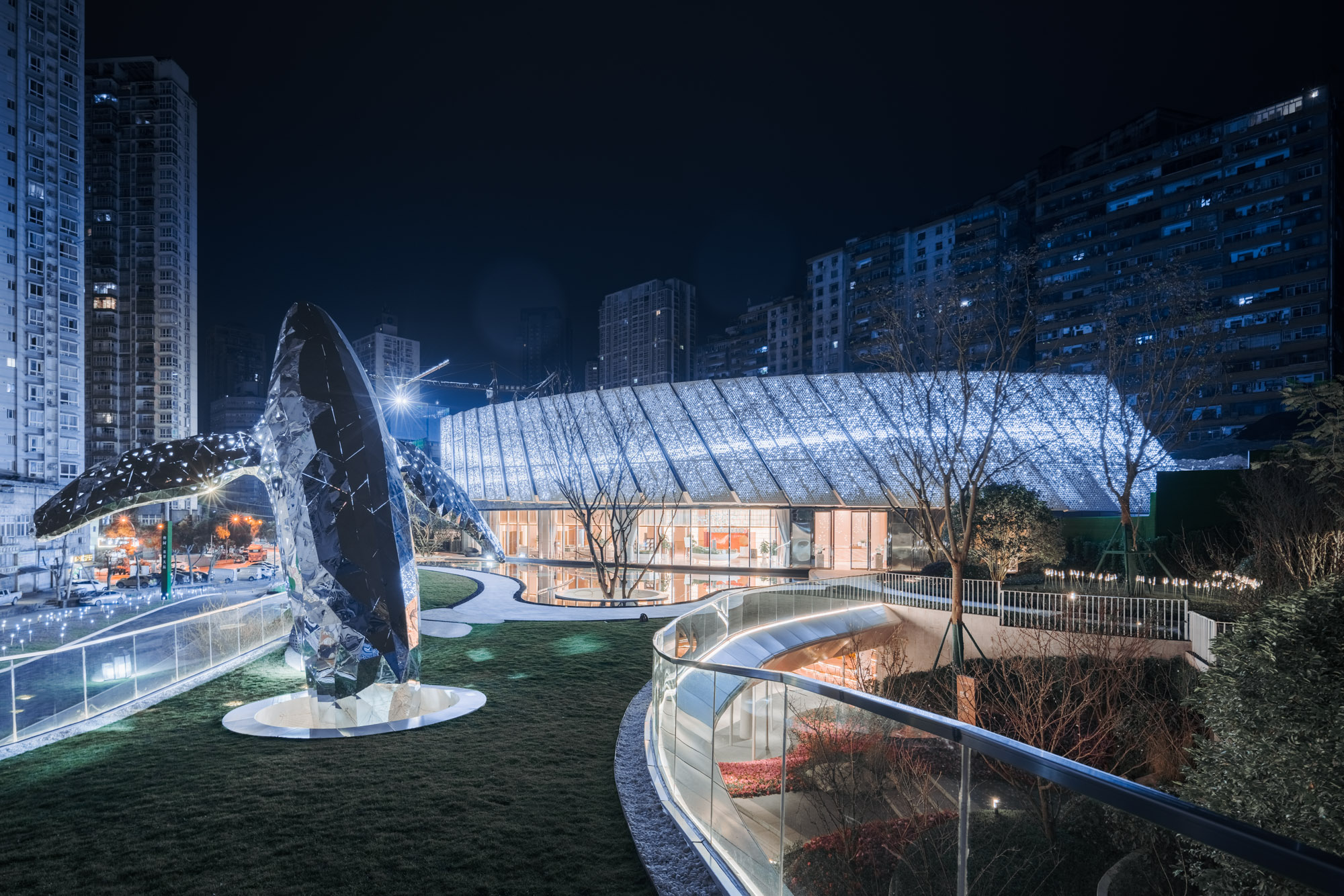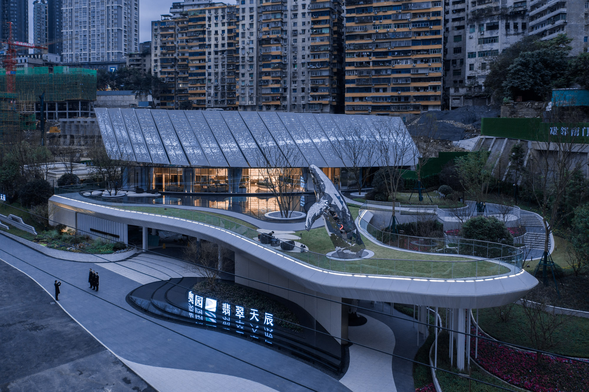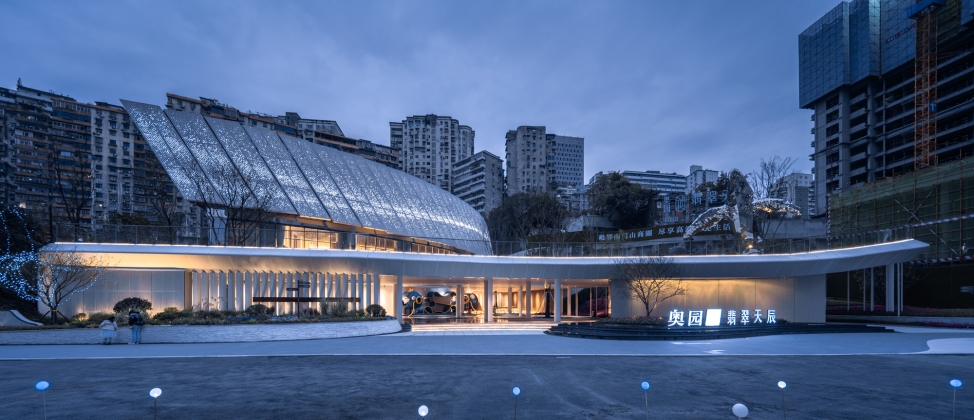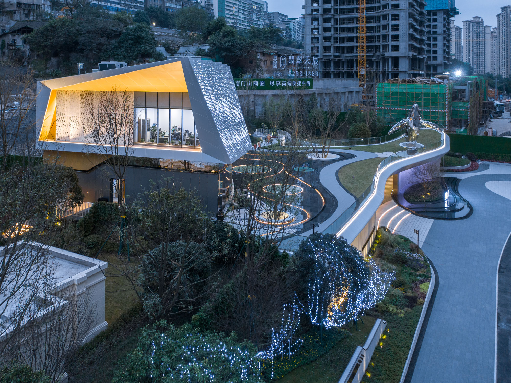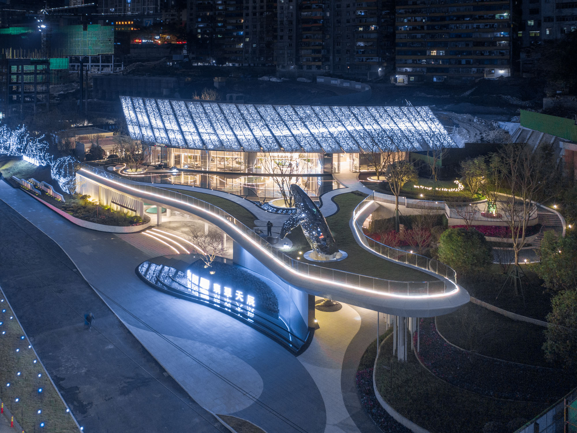 應“石魚出水兆豐年”之說,奧園·翡翠天辰示范區(qū)與長江中的白鶴梁水下博物館比鄰而居。項目設計以此為切入點,從白鶴梁題刻中一尾標注最早、枯水題刻的石魚中汲取設計靈感。示范區(qū)內(nèi),建筑以星河長帆為魂,景觀以大魚雕塑為魄,以江岸線為骨架,以山林為底色,建筑與景觀交融為一體,打造涪陵IP新地標——“漂浮的水岸藝術(shù)生活館”。在涪陵依山望水之地,勾勒出了“一舟一帆”兩道優(yōu)美交織的弧線。舒展的長帆劃過天空,留下了與萬家燈火遙相呼應的璀璨銀河。示范區(qū)以“迎- 享- 探- 觀- 賞”的游覽動線,開啟有方向性的、充滿好奇心的探索,讓來賓踏上一場愜意的體驗之旅。